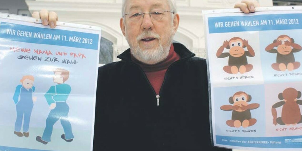 Am 11. März ist Bürgermeisterwahl und die Achterkerke-Stiftung will die Wahlberechtigten in den Kaiserbädern aufrütteln. „Demokratie braucht mehr Wähler als Nichtwähler!“ ist das Motto. Mit den bildhaften und aussagekräftigen Plakaten wie die 4 Affen „Nichts hören, nichts sehen, nichts sagen, nicht wählen?“, werden vor allem Jung- und Erstwähler angesprochen. Gemeinsam mit fleißigen Wahlhelfern aus der Region wird zum Urnengang des neuen Gemeindeoberhaupts mobilisiert. Stifter Heinz-Egon Achterkerke ist wie andere der Meinung, dass ein neues Gemeindeoberhaupt für die Fülle schwieriger Aufgaben eine möglichst breite demokratische Legitimation braucht. Und dass es sich eine demokratische Gesellschaft nicht leisten kann, Menschen mit Ideen und Visionen politisch abzuschreiben, ihre Initiative zu verschenken.