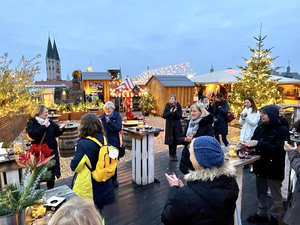 Im Anschluss wurde bei heißem Glühwein und leckeren Knödeln die Aussicht genossen, gute Gespräche geführt und Erfahrungen über das Patenleben im Corona-Alltag ausgetauscht. Danach konnten sich die Ehrenämtler am Eisstockschießen versuchen, wobei herzhaft gelacht wurde.