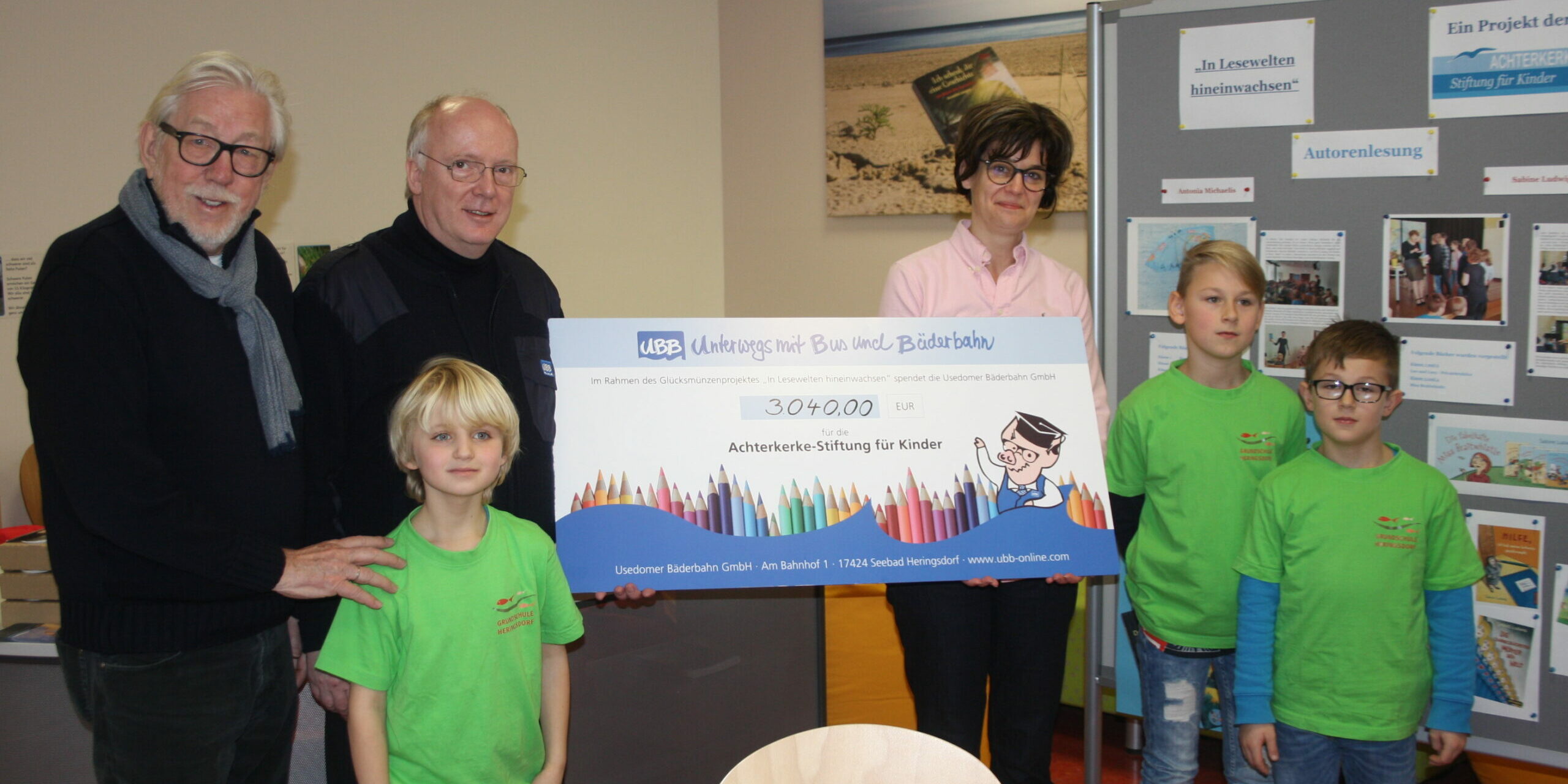 Mit dem Slogan „Schenken Sie Glück“ wurden Glückmünzen an allen Reisezentren der Usedomer Bäderbahn (UBB) für 2 Euro verkauft. Ein Euro davon kam dem Leseprojekt „In Lesewelten hineinwachsen“ zu Gute. Gemeinsam mit der UBB hat die Achterkerke-Stiftung die Glücksmünzen-Aktion ins Leben gerufen. In diesem Jahr ging der Erlös von mehr als 3.000 € an die Grundschule Heringsdorf um die Entwicklung der Lesekompetenz der Schüler*innen zu fördern. „diese stolze Summe, die hier herausgekommen ist, hat mich selbst beeindruckt. Natürlich ist die Freude groß, dass sie unseren Grundschülern zur Förderung der Leseleitung und anderer Projekte zugute kommen“, so Jörgen Boße (UBB).