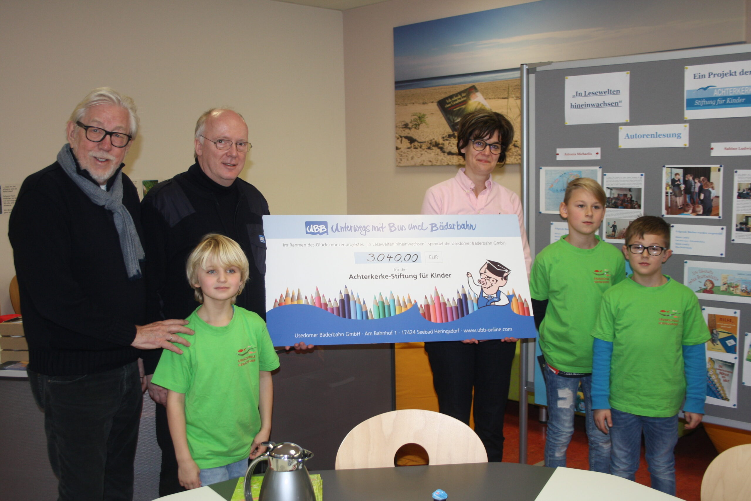 Mit dem Slogan „Schenken Sie Glück“ wurden Glückmünzen an allen Reisezentren der Usedomer Bäderbahn (UBB) für 2 Euro verkauft. Ein Euro davon kam dem Leseprojekt „In Lesewelten hineinwachsen“ zu Gute. Gemeinsam mit der UBB hat die Achterkerke-Stiftung die Glücksmünzen-Aktion ins Leben gerufen. In diesem Jahr ging der Erlös von mehr als 3.000 € an die Grundschule Heringsdorf um die Entwicklung der Lesekompetenz der Schüler*innen zu fördern. „diese stolze Summe, die hier herausgekommen ist, hat mich selbst beeindruckt. Natürlich ist die Freude groß, dass sie unseren Grundschülern zur Förderung der Leseleitung und anderer Projekte zugute kommen“, so Jörgen Boße (UBB).