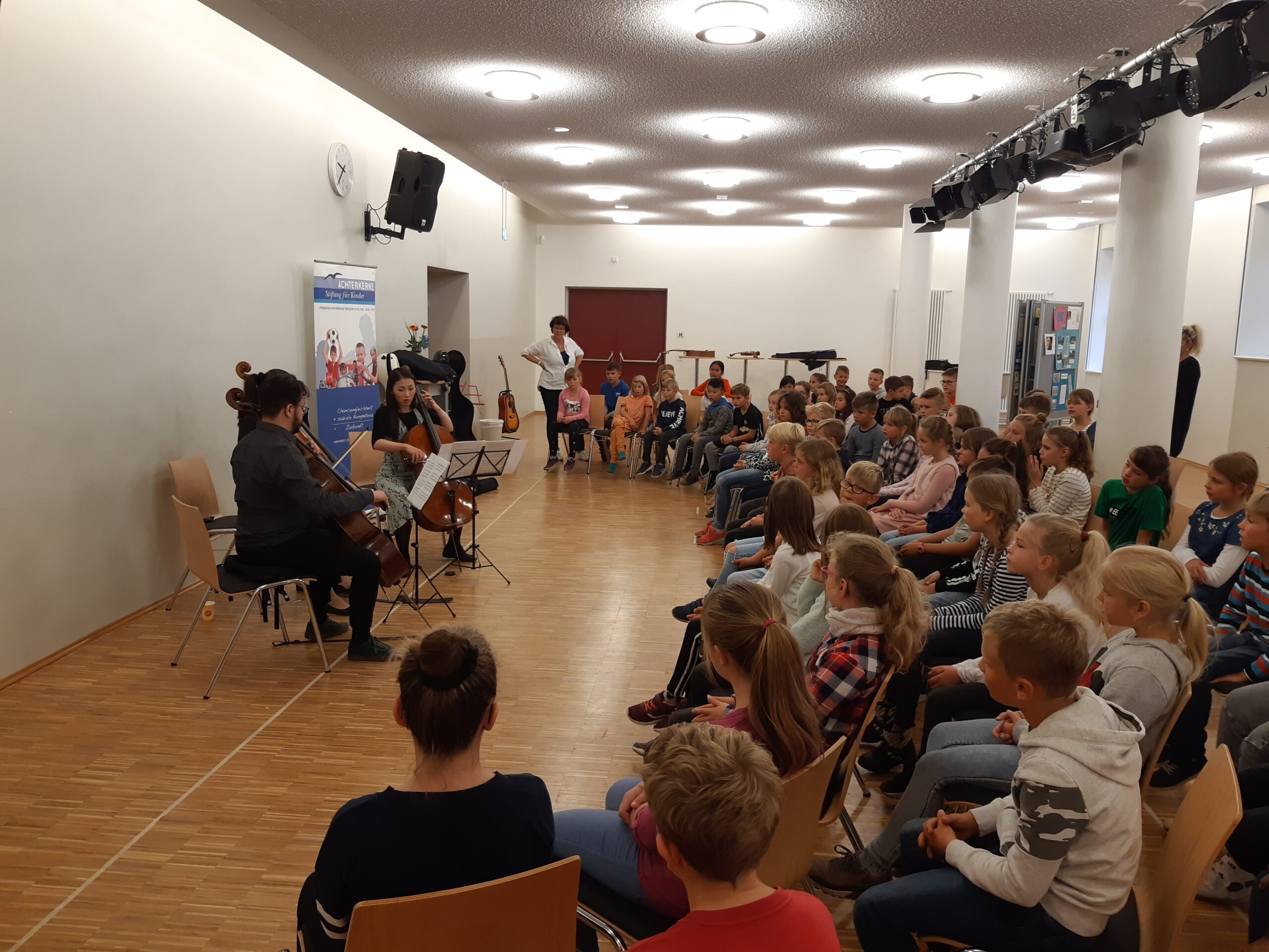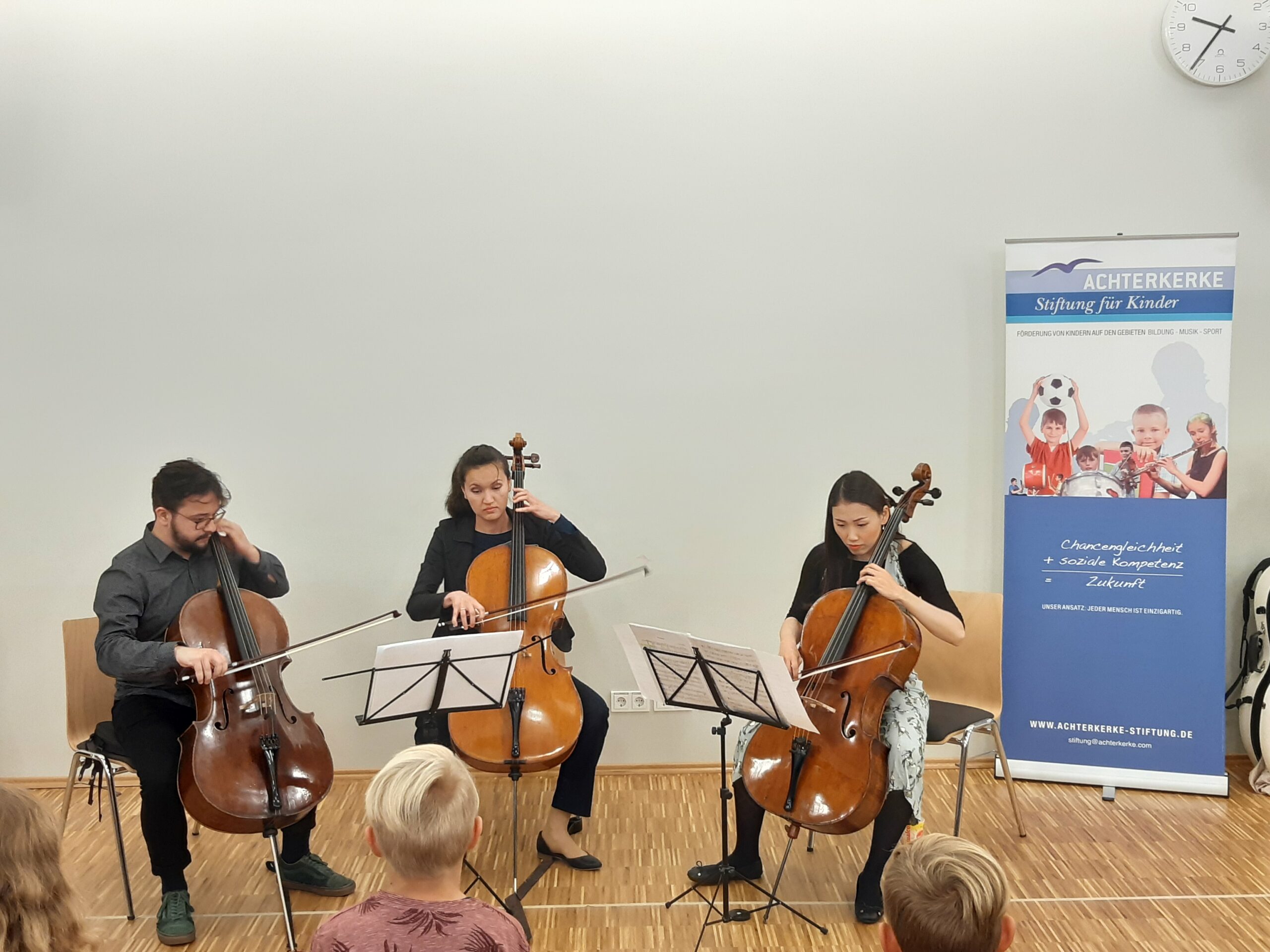 Auch in diesem Jahr zeigten die Meisterschüler von Cello-Virtuose David Geringas den Grundschüler*innen das Cello-Spiel ineiner ganz besonderen Art und Weise. Dafür waren nicht etwa die Schüler im Konzertsaal, sondern die Cellisten kamen in die Grundschulen zum Vorspielen. Im Anschluss konnten die Schüler Fragen rund um das Instrument stellen.